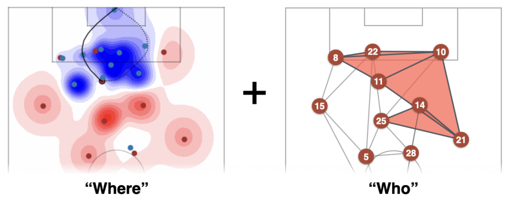 選手配置から決まるスペース支配の場の上で経路積分によって配置の良さを評価してきた昨年度までの研究(2023年度、2024年度 同コンペ最優秀賞受賞)を基盤として、今年度は近年サッカー戦術上の重要性が増しているポジションチェンジの解析に挑みました。近接選手が作るトライアングルのカイラリティによってポジションチェンジを定量的に捉える手法の提案とそれによる解析の結果が評価され、当研究室として3年連続の最優秀賞受賞となりました。